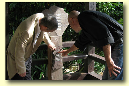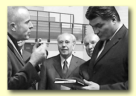 M.L. Dioptaz présentant son livre sur la Voie du Sarbacana à David Douillet(au centre de la photo: M. Franck Borotra président du conseil général des Yvelines, à sa droite le préfet M. Niquet. 16 juin 2003)photo: Michèle Pascal