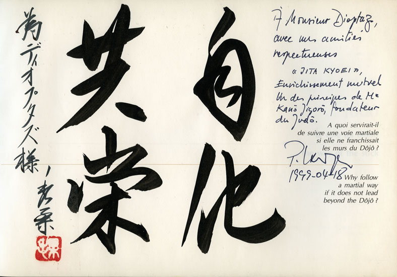 Calligraphie réalisée et offerte, le 1octobre 2008, par maître Masamichi Noro à maître Michel-Laurent Dioptaz. (voir site de M.L.Dioptaz:www.dioptaz.com)