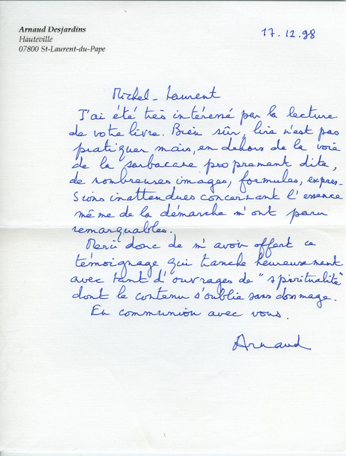 Lettre de Roland Habersetzer à Michel-Laurent Dioptaz en écho à l'ouvrage "Sarbacana" (27 avril 1999).
